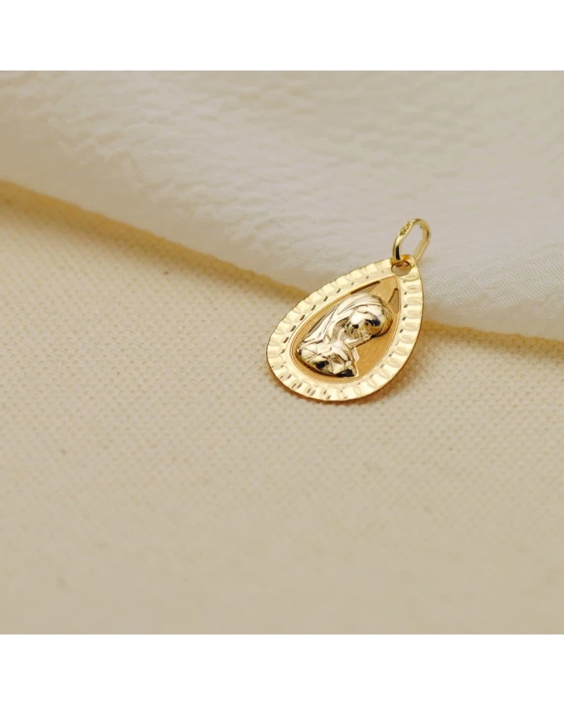 Medalla de oro de 9 kilates de la virgen niña, tiene un tamaño de 21×13 mm.