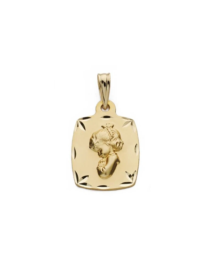 Medalla de oro de 9 kilates de la virgen niña, tiene un tamaño de 19×13 mm.