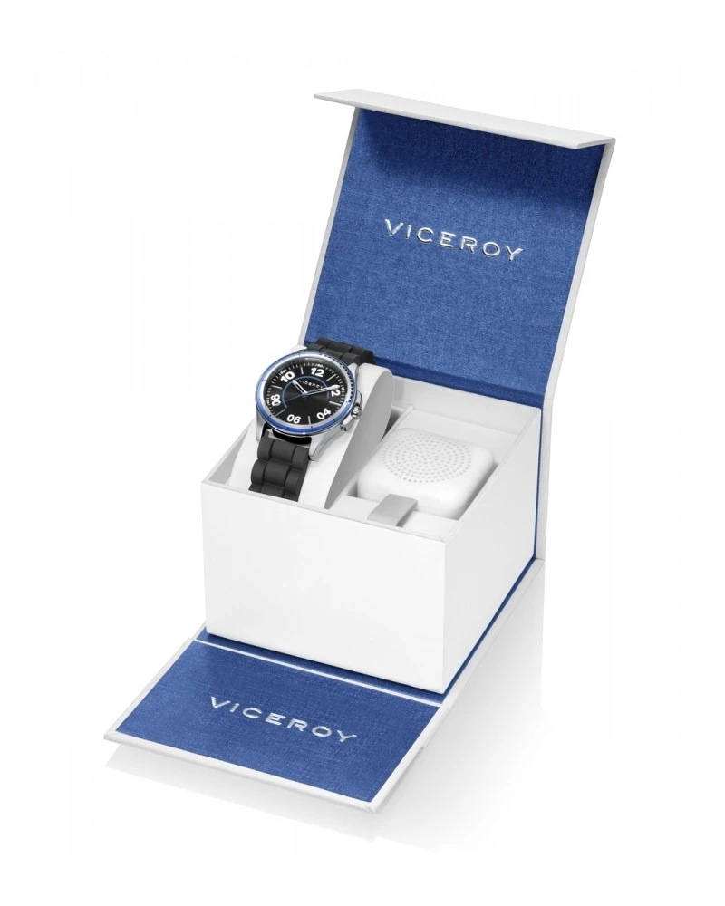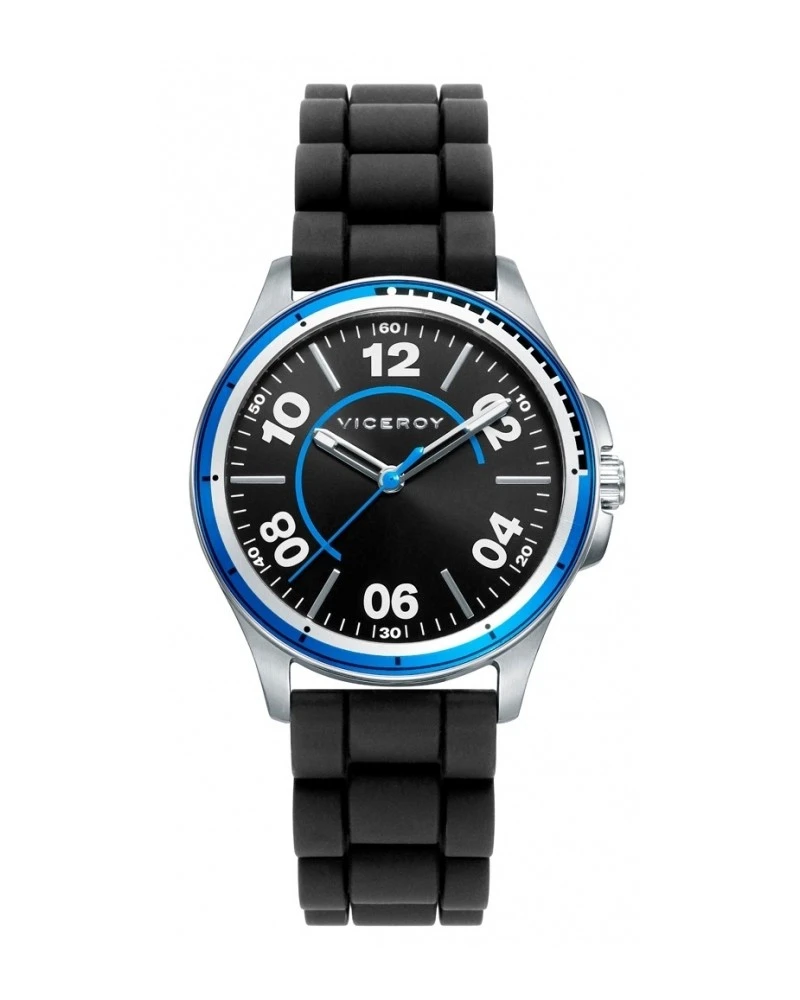 Con correa de silicona en color negro de largo estándar para niños de 8/9 años y, con hebilla de acero.