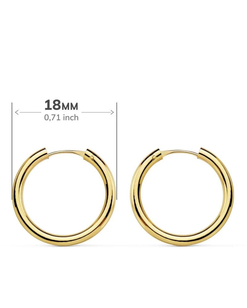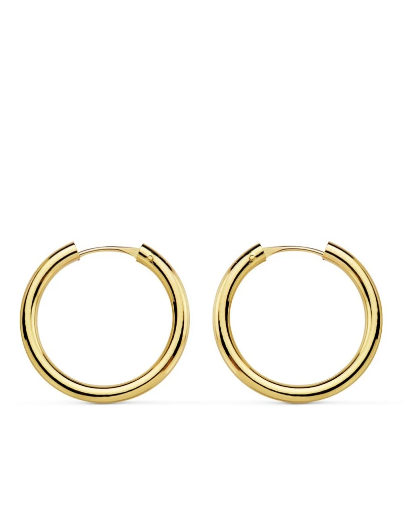 Aros redondos lisos y ligeros. El tamaño de los pendientes es de 18 x 2 mm. Estos pendientes forman parte de la colección de oro de Falomir Joyas, y se entrega con estuche y marca de contraste oficial.