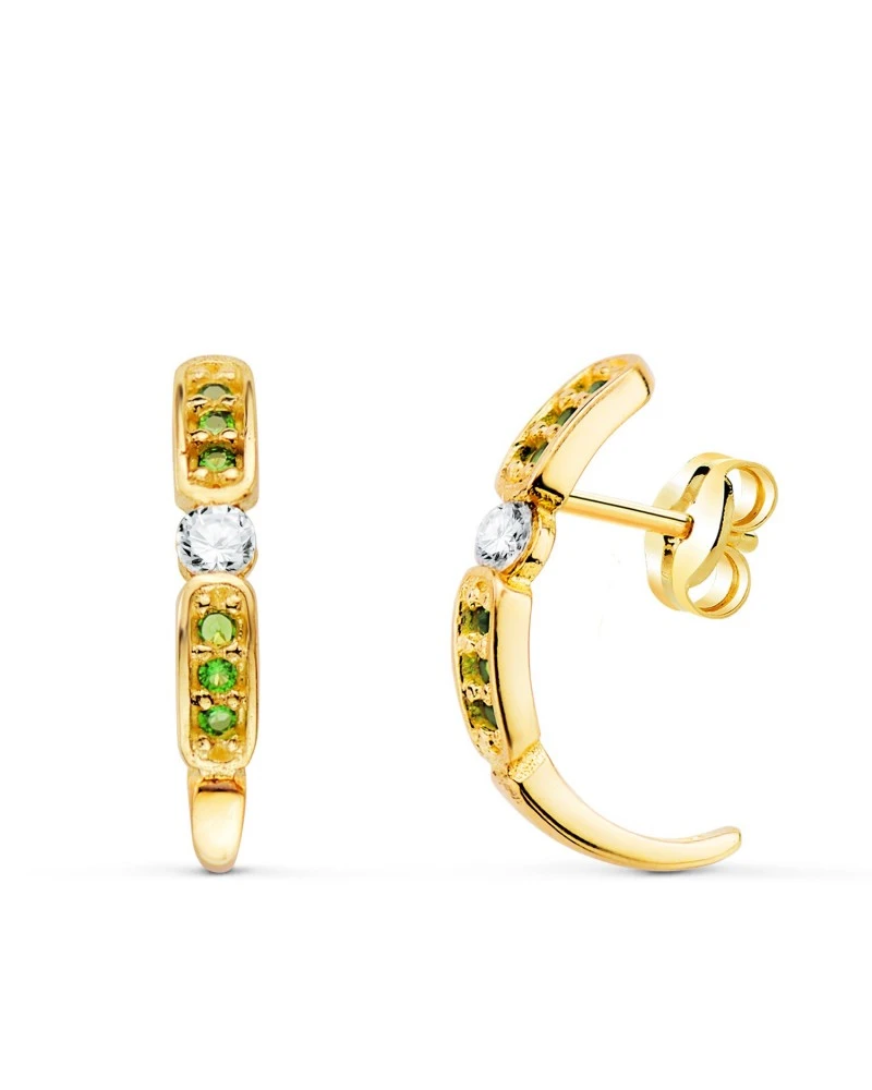 18K PENDIENTES ORO AMARILLO MEDIO ARO ABIERTO CON CIRCONTIAS VERDES 16 X 3 MM. CIERRE PRESION