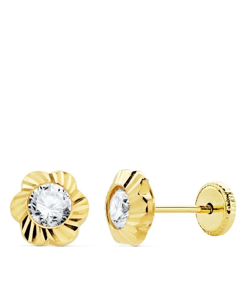 18K PENDIENTES ORO AMARILLO FLOR TALLADA 7X7 MM. CIERRE TUERCA