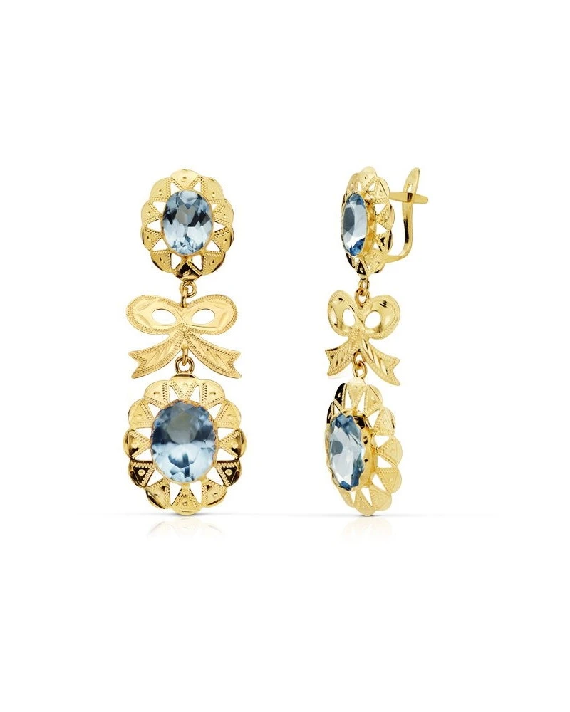Pendientes de oro amarillo de 18 kilates con piedras color amatista y cierre de palanca. Tienen un tamaño de 43 x 15mm. Estos pendientes forman parte de la colección oro de Falomir joyas. Los pendientes incluyen marca de contraste 750, sello oficial y se entrega con estuche de la marca.