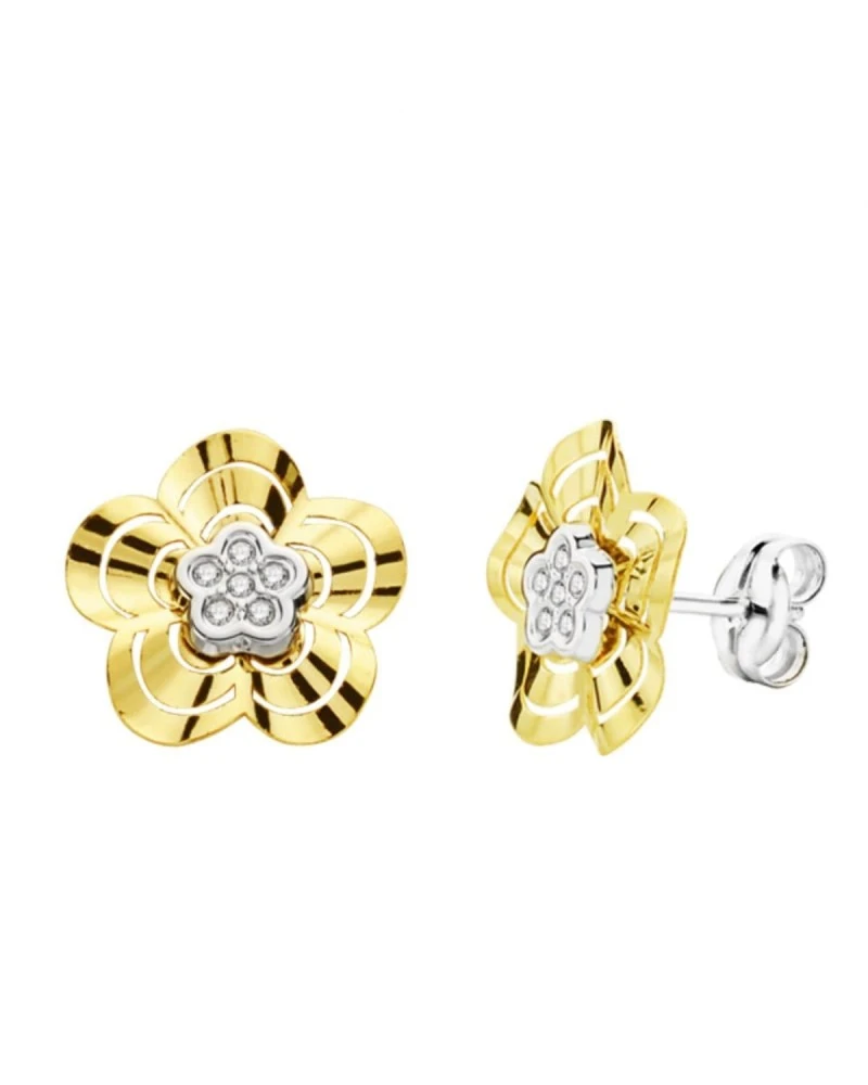 PENDIENTES ORO BICOLOR FLOR CIRCONITAS 10X10 MM CIERRE PRESION