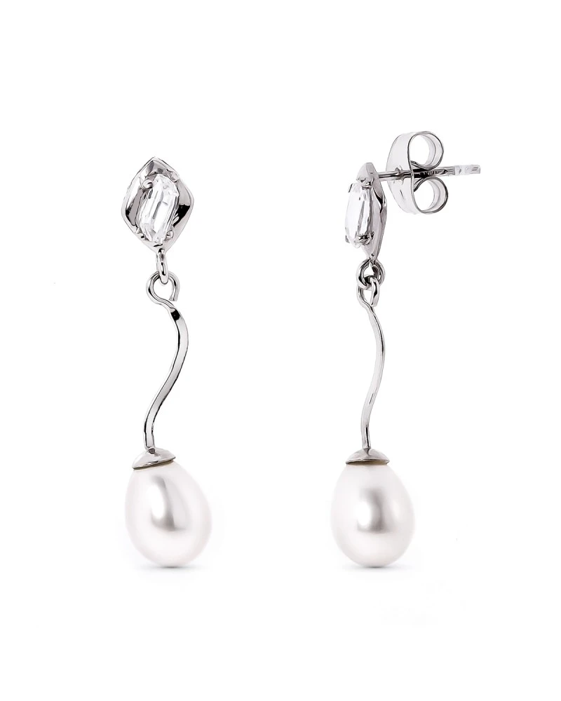 Pendientes de oro colgantes con una perla y circonitas. Están diseñados en oro blanco de 18 kilates. Son unos pendientes ide ales tanto para el día a día, como para novia o eventos. Estos pendientes forman parte de la colección oro de Falomir joyas. Los pendientes incluyen marca de contraste 750, sello oficial y se entrega con estuche de la marca.