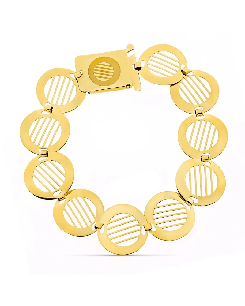 Pulsera de oro amarillo de 18 kilates. Esta pulsera forma parte de la colección de oro de Falomir Joyas. Incluye una marca de contraste oficial 750, sello de fabricante y se entrega con estuche y marca de contraste oficial. Las características de esta pulsera son: Largo: 18,5 cm, ancho: 16 mm.
