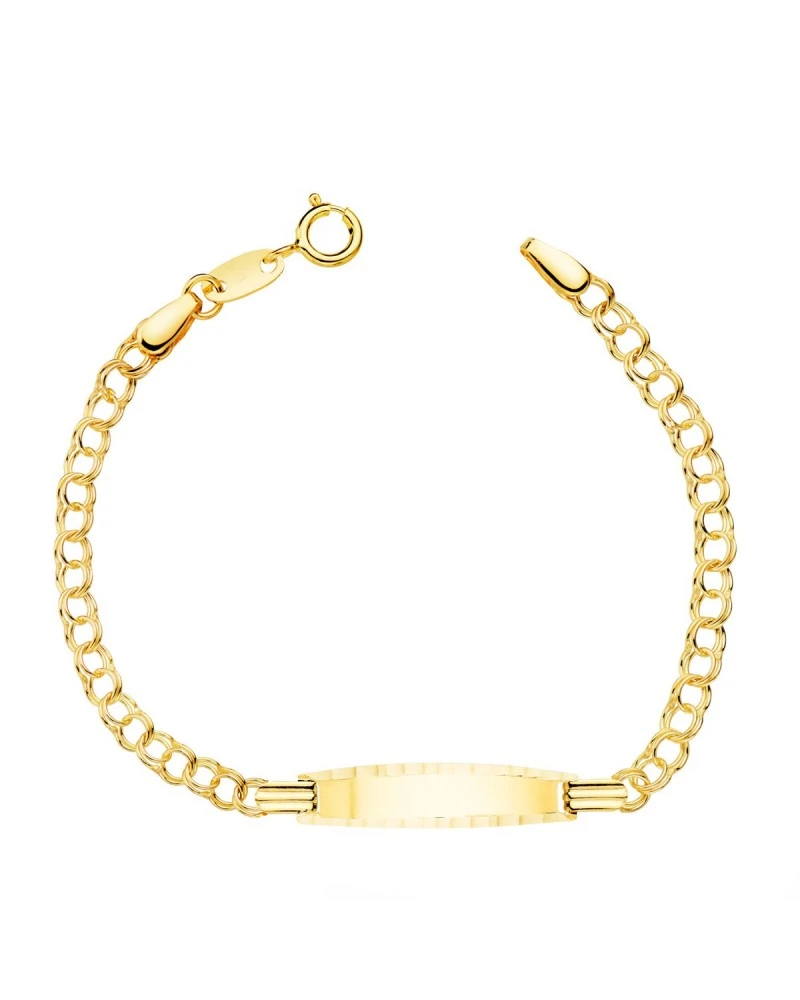 Pulsera para bebé en oro de 18 kilates con un diseño de esclava ideal para grabar el nombre y la fecha de nacimiento.Tiene un largo de 13 cm.Incluye una marca de contraste oficial 750 y sello de fabricante. Se entrega con estuche y toda la garantía de la joyería más antigua de España.