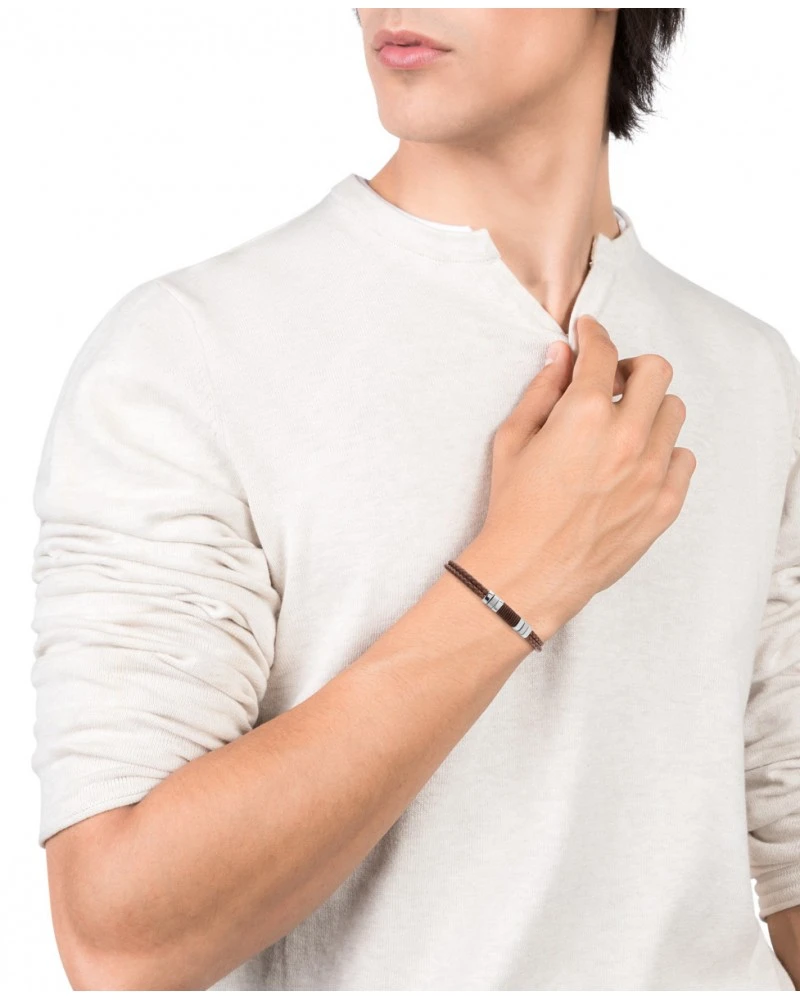 Esta pulsera está fabricada en piel de color marrón y acero.