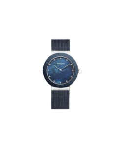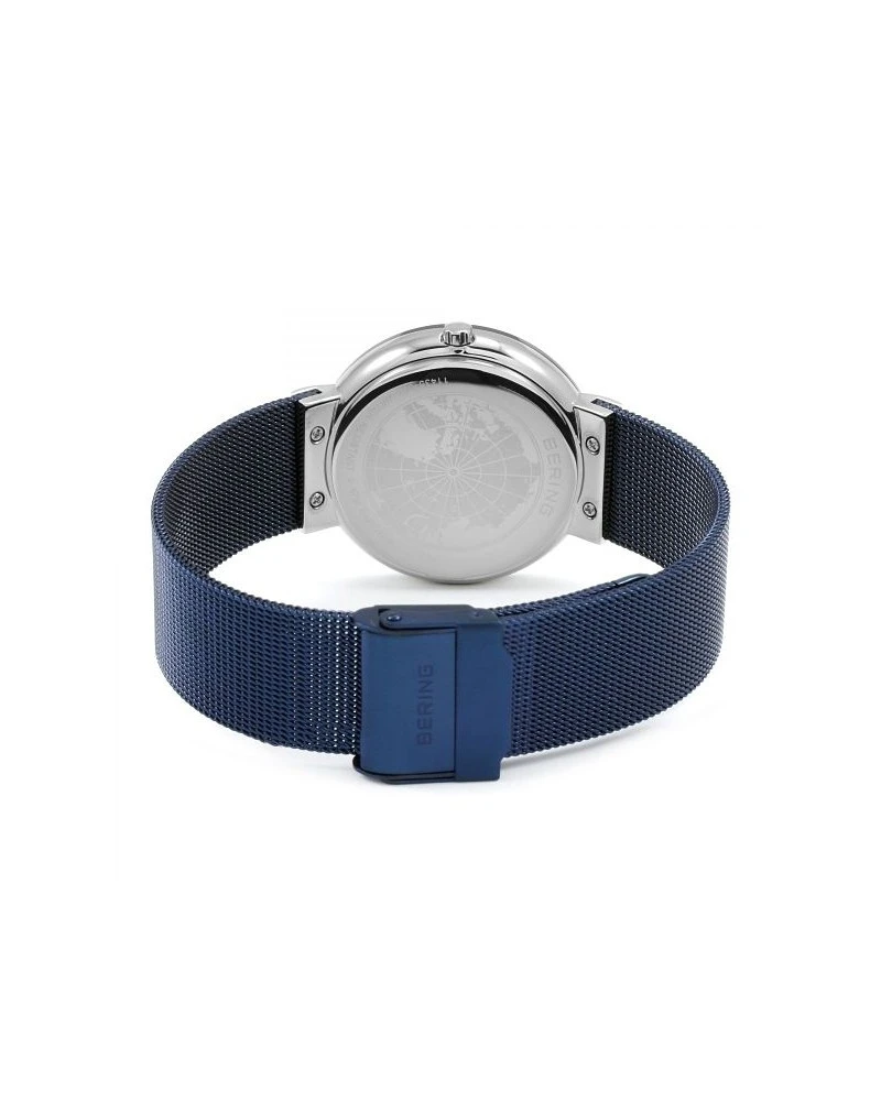 Un moderno reloj de la marca BERING. Con caja y cadena de acero inoxidable con un baño azul marino.