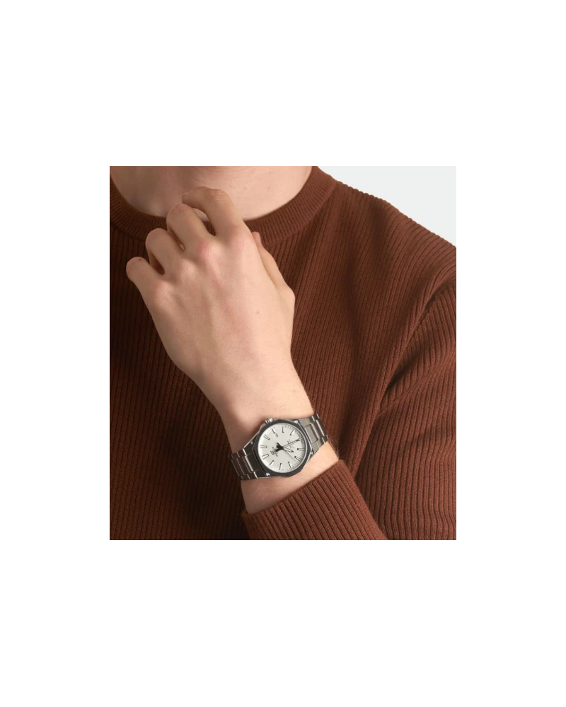 Este reloj tiene una cadena de acero de eslabones y, una caja del mismo material