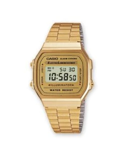 Reloj Casio vintage con color dorado. La caja tiene escritas todas las características y funciones que presenta éste reloj en los laterales, junto a cada uno de los pulsadores. Así encontraremos escrito: