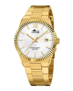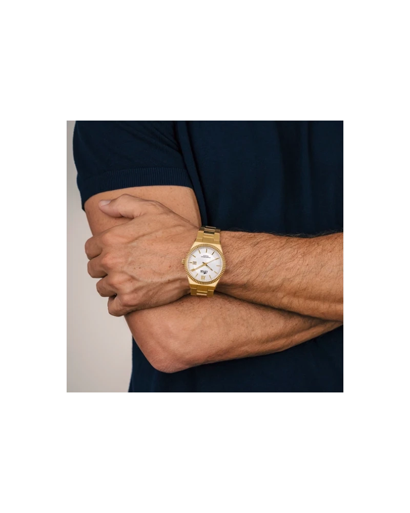Con una esfera en color blanco roto podemos ver todos los números representados con índices en color dorado, a juego con la cadena del reloj. A excepción del número 12 que va escrito con números romanos.