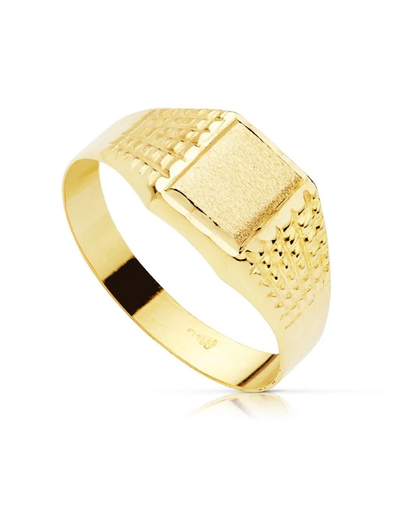Sello de oro amarillo de 18 kilates ideal para niño en edad de comunión. El sello es hueco con cabeza rectangular matizada y con un ancho de 7 x 6 mm. Este sello forma parte de la colección de oro de Falomir Joyas, y se entrega con estuche y marca de contraste oficial.