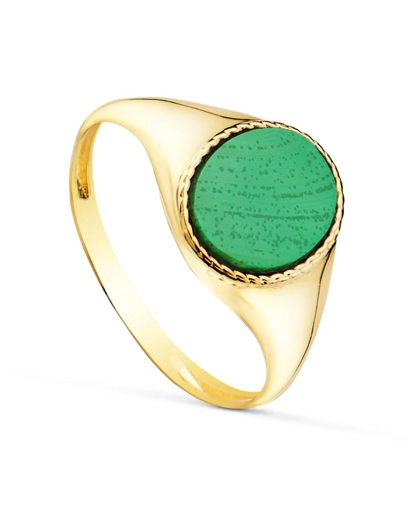 18K SELLO ORO AMARILLO BRILLO CON PIEDRA OVAL MALAQUITA 10 X 8 MM .