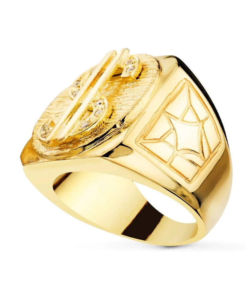 Sello de oro amarillo de 18k con forma de dólar y circonitas y un tamaño de 22x20mm.
