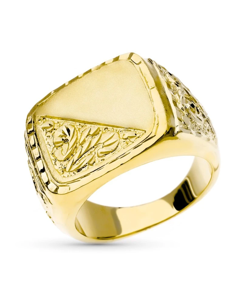 Sello de oro amarillo de 18k con un tamaño de 19x21mm.