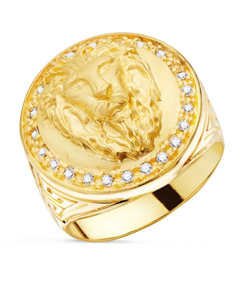 Sello de oro amarillo de 18k con forma de león, circonitas y un ancho de 19mm.