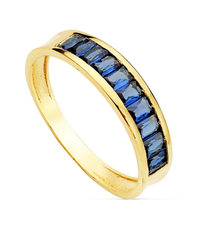 Sortija de oro amarillo de 18k circonitas azules talla baguette. Ancho 4.5 mm
