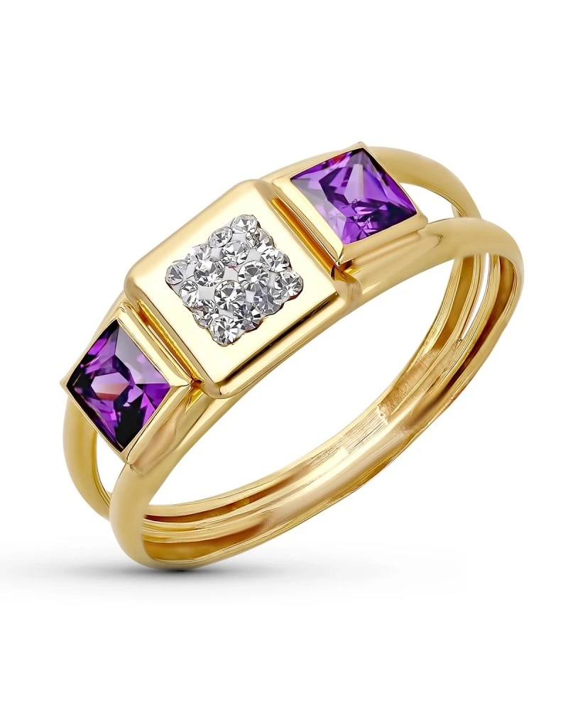 Sortija de 9k de oro amarillo circonitas y piedra amatista