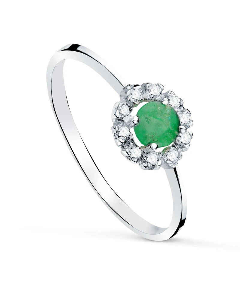 Sortija de oro blanco de 18k con esmeralda 4mm y 0,26 qtes y circonitas. Cuajo 7 x 7 m
