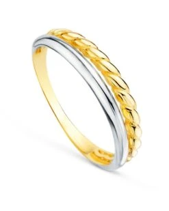 Sortija de oro blanco y amarillo de 18k doble banda lisa y reliada. Ancho: 4mm