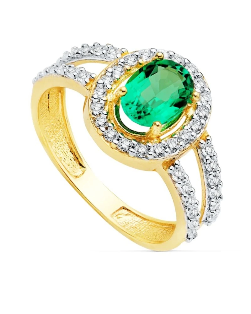 Sortija de oro blanco y amarillo de 18k con circonitas y esmeralda 0.79 qtes de 7×5 mm